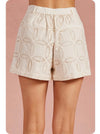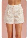 Tailored shorts in cotton embroidered geometric eyelet fabric. This style features flat front waistband with elastic at back, belt loops, side pockets, welt back pockets, geo eyelet pattern, front pleat, intricate artisanal flower button closure with zipper fly, and full lining.