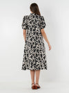 The Hampton Dress in Boot Print showcases an abstract pattern created from interlocking boot outlines, a nod to western heritage reimagined with modern flair. The black and ivory woven fabric adds soft texture and visual dimension, giving the design depth and character. This midi-length silhouette features a mandarin collar, V-neckline, puff sleeves, and a trapunto-stitched hem, finished with functional side seam pockets for effortless wear.