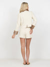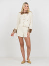 The Lady Jacket in Winter White features fur trim along the collar and wrist cuffs, signature gold button closures, and front patch pockets. Designed in a structured tweed fabric, this jacket has a chic boxy silhouette that balances polish with a touch of playfulness. Pair it with the matching Saylor Short for a festive holiday set that can live on for years to come.