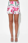 The shorts typically feature a high-waisted silhouette and a tailored fit through the hips, flaring slightly at the leg for a flattering, "skort-like" appearance. The "Tulip Floral" print is a lush arrangement of pinks, corals, and greens, making the shorts feel like a wearable garden.