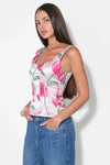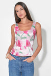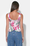 The jacquard construction gives the top a rich, embossed texture and a slight structural "stiffness" that allows it to hold its shape beautifully. As a sleeveless design, it offers a clean, streamlined silhouette that draws focus to the artistry of the print.