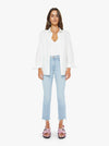 Chosen one. This iconic high-waisted bootcut is cropped at the ankle with a zip fly and a frayed step-hem. Made from denim with a touch of stretch, You're My Favorite is a light blue with subtle whiskering and fading at the knee. MOTHER's go-to.