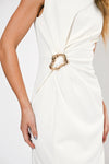 Rendered in a clean, luminous Ivory, this dress features a stunning twisted waist detail that creates a natural cinched effect and elegant ruching across the midsection. The midi-length silhouette offers a refined and modest hemline, while the tailored bodice provides a structured yet feminine fit.