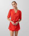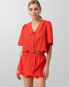 - Lightweight non-stretch cotton fabric- Collared- Short sleeve- Front button placket- Lace trim detail along the sleeve opening- Scallop edged hem- Unlined